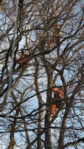 Sie kamen relativ früh, es war noch unter Null. Die vier begrüssten sich alle mit Umarmung. Schon das berührte mich sehr. Die Vorbereitungsarbeiten mit dem Raufwerfen diverser ganz feiner Seile mit einem Lot waren für mich „Spanisch“, hatten aber bestimmt ihren Sinn. Nach 1 ½ Stunden gab es Pause. Der Eine, vielleicht der Teamleiter, nahm für jeden eine Banane und gab sie ihm. Um sich aufzuwärmen, machten sie einige „Turnübungen“. Nachdem sie wohl irgendwo einen Kaffee getrunken hatten, kamen sie zurück, und es ging „zur Sache“. Wie sie sich beim Raufklettern, beim Achten auf Fussgänger oder eventuelle Autos, beim Achten aufeinander (einer blieb unten und überwachte das Ganze) gegenseitig unterstützten und dabei auch mal ein Lied gesungen haben, hat mich tief beeindruckt. Sie wissen um das Risiko ihrer Arbeit und wissen, wie wichtig ihre Teamarbeit und ihr Team-Spirit ist, wie sehr sie aufeinander angewiesen sind. Und gleichzeitig spürte man ihnen ab, dass sie diese Arbeit mit Leib und Seele tun, mit der Natur verwoben sind und dann auch mal der Freude mit einem Lied Ausdruck verleihen können.